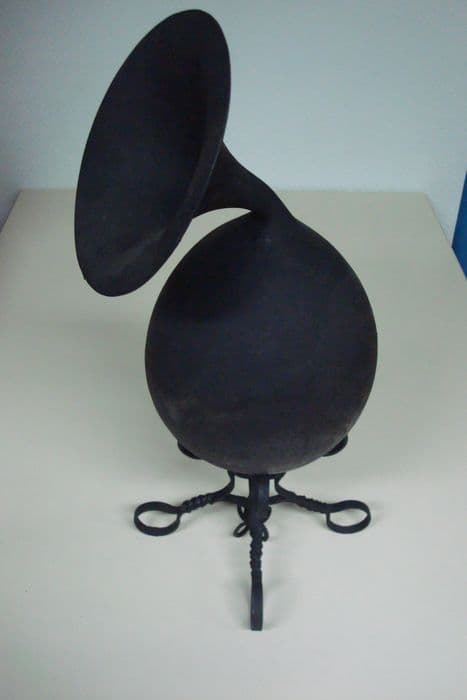 Grand vase au corps en forme de goutte d'eau, col étranglé et collerette désaxée ; supporté par quatre pieds en métal torsadé.