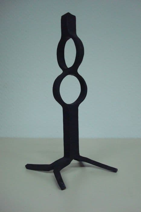 Cet objet est un "exercice"" de ferronnerie obtenu par façonnage d'une barre de métal de section carrée. Il montre les diverses possibilités de travailler le métal au marteau.