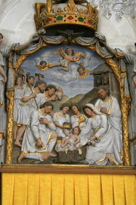 Oeuvres exécutées entre 1694 et 1698 : l'Adoration des Bergers faisait partie du retable commandé en 1694 à Nicolas Bouteiller père, resté inachevé à sa mort, et terminé par son fils vers 1698.
