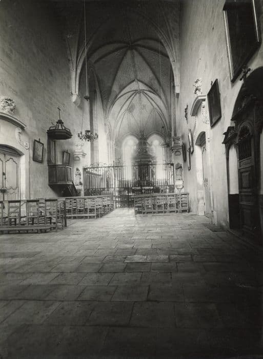 Sépare le choeur de la nef. Est disposée selon un tracé rectiligne, entre deux massifs de pierre décorés. Au centre : porte à deux battants ; de part et d'autre de la porte, la base de la grille repose sur un muret ; dans le sens de la hauteur, la grille comporte deux registres séparés par une bande de volutes affrontées. Partie supérieure : porte trois groupes de volutes de plus grandes dimensions que les précédentes ; celles des parties latérales s'appuient au milieu sur une fleur de lys ; celles qui surmontent la porte la porte sont sommées d'une croix.