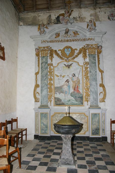 Partie inférieure : comporte un bas-relief en terre cuite représentant le Baptême du Christ ; de part et d'autre, deux pilastres surmontés de chapiteaux composites. Partie supérieure : au-dessus de l'entablement, un arc surbaissé se raccorde avec les parties horizontales du couronnement aux extrémités latérales.