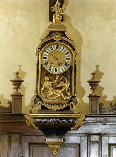 Corps du cartel et de la console en bois marqueté. Monture et décor en bronze.
