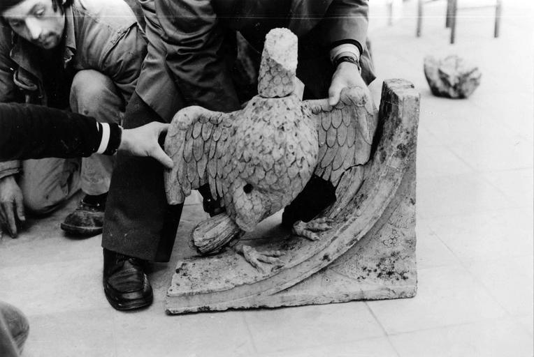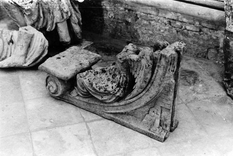 Divers fragments subsistent, placés contre le mur, au-dessus des statues.