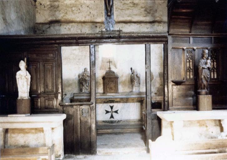 Au centre, une ouverture servant de passage est bordée par deux montants verticaux. De chaque côté de ceux-ci, un panneau occupe la partie inférieure, celui de droite étant plus étroit que celui de gauche. A gauche, les panneaux sont complets ; ils présentent trois étages de tablettes. A droite, les panneaux, disposés verticalement, sont surmontés d'un dais, soutenu par des pièces de bois arquées, et bordé d'une petite balustrade. Reposant sur la corniche, au-dessus du passage central, se trouve un Christ en croix, dont les bras sont rapportés. Certaines parties ont été refaites.