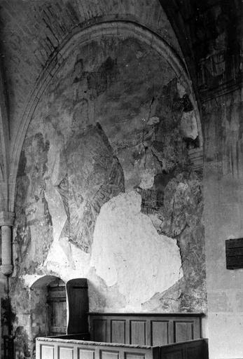 Saint Christophe : à fresque, couvre le mur ouest presqu'entièrement jusqu'au sommet de l'ogive. Saint georges terrassant le dragon : mur sud, côté est. La Chasse de saint Hubert : mur est. Sainte Barbe : côté sud
