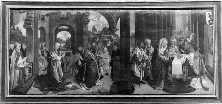 Ex-voto constitué de deux panneaux peints représentant l'Adoration des Bergers, et la Présentation au Temple, pour un panneau, et l'Adoration des Mages, saint Roch découvrant sa plaie, et la décollation de saint Jean-Baptiste, pour l'autre.