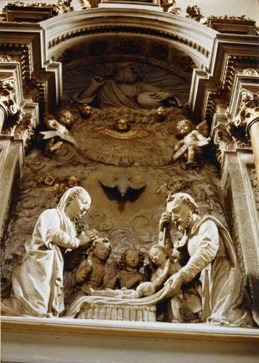 Partie inférieure : comporte deux registres séparés par une forte moularation ; le registre supérieur comprend les socles des colonnes de la partie supérieure ; en bas, le gradin d'autel est en bois sculpté, peint et doré. Partie supérieure : qautre colonnes de marbre séparent une partie centrale et deux parties latérales ; la partie centrale un groupe sculpté en terre cuite, qui représente la Nativité. Parties latérales : chacune comporte une niche contenant une statue en terre cuite : à gauche, une sainte Femme, à droite, un saint personnage. Couronnement : au-dessus des colonnes, quatre architraves étroites portent la retombée de l'arc central, et les socles ; la partie supérieure présente un fronton courbe brisé à enroulements.