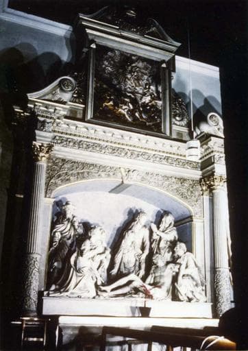 Partie inférieure : encadrée par deux pilastres, en avant desquels se trouvent deux colonnes ; au centre, un enfeu contenant le groupe sculpté de la Mise au Tombeau. Entablement : en avancée au-dessus des colonnes. Partie supérieure : un fronton coupé contient un bas-relief représentant la Résurrection du Christ ; il est surmonté d'un entablement portant un petit fronton courbe coupé. Autel : en pierre.