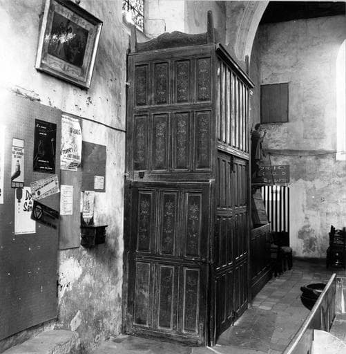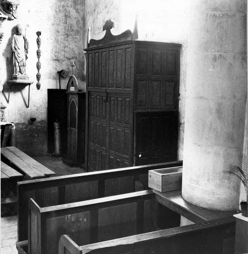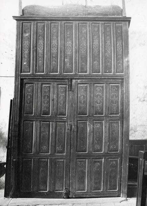 Nef, porte d'entrée : la partie inférieure de la face principale comporte une porte à deux battants, avec pour chaque porte trois rangées horizontales de trois panneaux rectangulaires en hauteur ; la partie supérieure comprend sept traverse verticales avec huit panneaux rectangulaires en hauteur ; la partie inférieure de la face latérale sud comporte une porte avec loquet, à deux rangées de trois panneaux rectangulaires en hauteur, et une traverse horizontale médiane ; la face latérale nord présente quatre rangées de quatre panneaux rectangulaires en hauteur et trois traverses horizontales ; le couronnement a trois faces verticales à arêté supérieure contournée, quatre petites pyramides aux angles, et une corniche moulurée sur la face principale. Transept, croisillon sud : la partie inférieure de la face principale comporte une porte à deux battants ; à chaque battant, correspondent trois rangées de trois panneaux rectangulaires posés en hauteur ; deux traverses horizontales ; la partie supérieure comporte six panneaux rectangulaires en hauteur, séparés par cinq traverses verticales ; la partie inférieure de la face latérale ouest a une porte à deux rangées de trois panneaux rectangulaires en hauteur et une traverse horizontale médiane ; au-dessus, deux rangées de trois panneaux rectangulaires ; la face latérale est présente quatre rangées de trois panneaux ; le couronnement a une forme contournée au-dessus de la face principale, et deux petites pyramides d'angle.