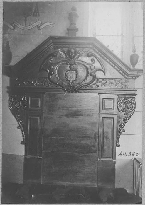 Armoiries : armes de Louis de Bastard, avec demi-aigle, et demi-fleur de lys (sur le dossier).