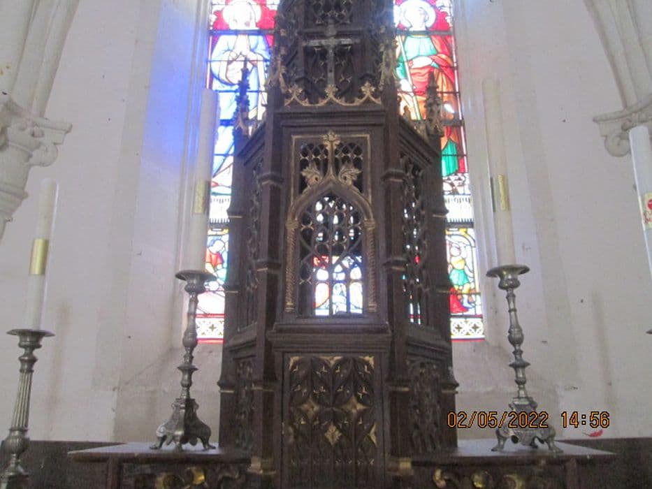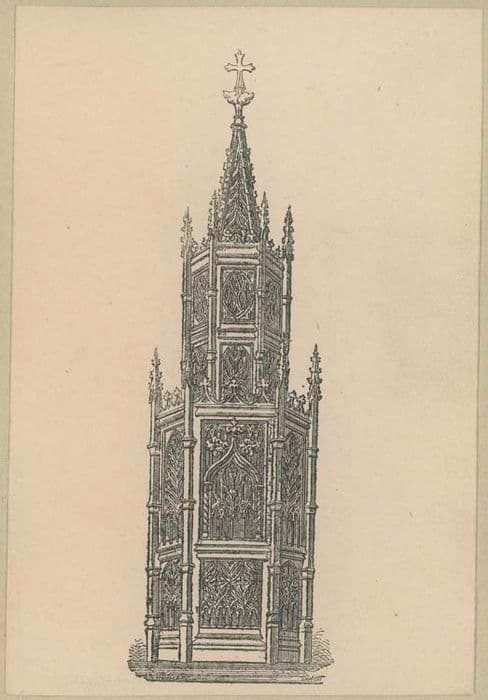Se présente sous la forme d'une sorte de tour à deux étages, le second étant en retrait sur le premier. Les six faces de ce meuble sont découpées et évidées par des fenestrages, et étaient autrefois dotées de pièces de verre.