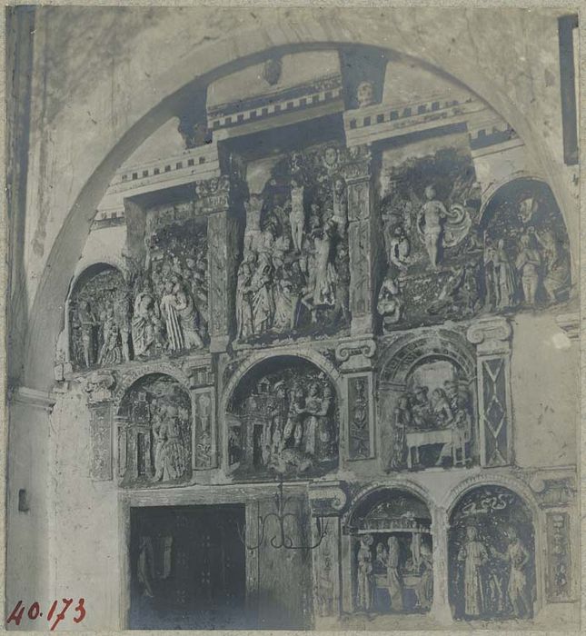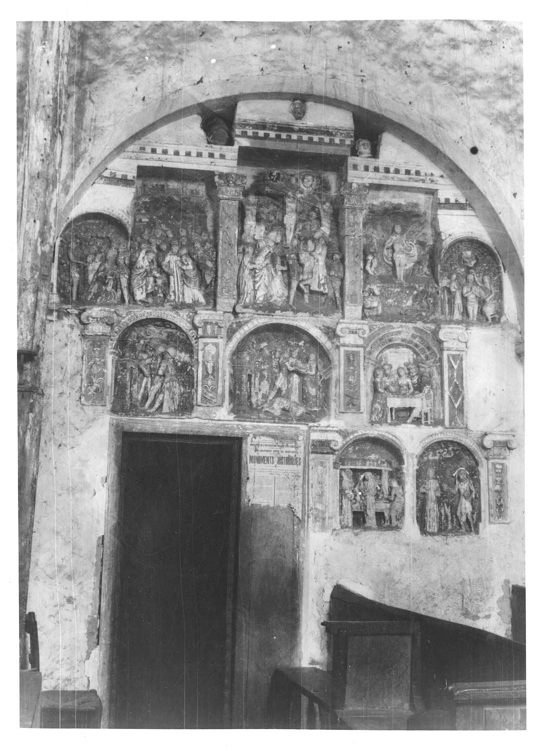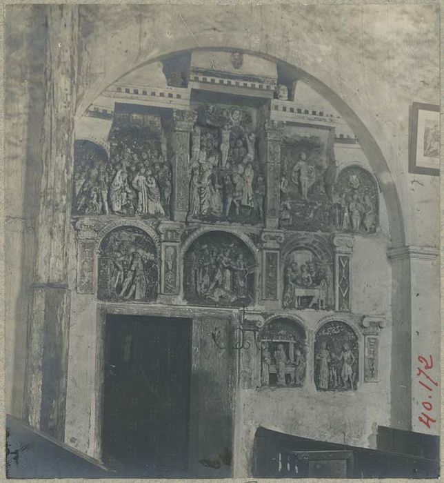 Ces bas-reliefs proviennent d'un retable détruit, et ont été encastrés dans un mur, avec des parties architecturales de ce retable.