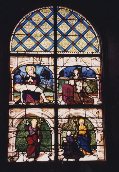 Les verrières représentent la Vierge de Pitié, des dames du 16e siècle à genoux sur un prie-Dieu, le Christ ressuscité, un donateur à genoux présenté par son patron saint Philippe, et l'Adoration des Mages.
