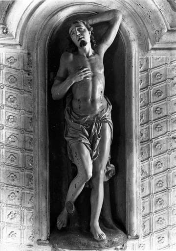 Le retable présente une forme concave. Il est bordé de chaque côté par un pilastre. Au centre, une niche contient une statue de saint Sébastien. La bordure extérieure, en retour d'angle vers l'entrée du choeur, est un pilastre analogue aux précédents.