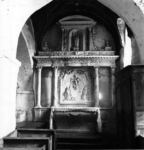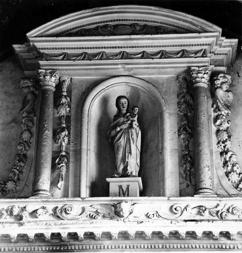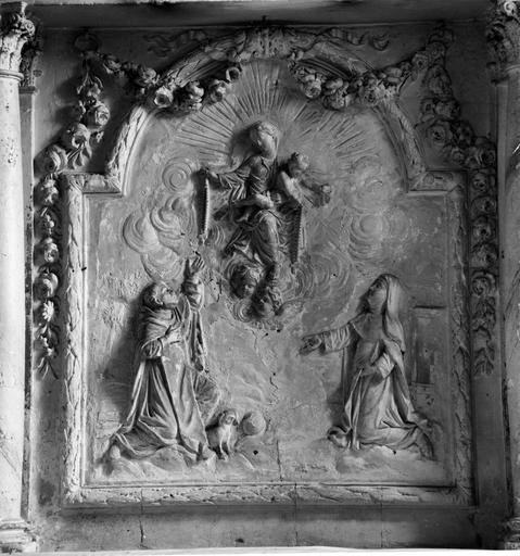 Etage inférieur : quatre colonnes de pierre séparent une partie centrale et deux parties latérales. Partie centrale : comporte un haut-relief en terre cuite représentant la Vierge à l'Enfant donnant le rosaire à saint Dominique et à sainte Catherine de Sienne. Parties latérales : en haut de chacune d'elles, un médaillon renferme un profil en bas-relief. Partie supérieure : le soubassement est un peu plus court que la corniche qu'il surmonte ; il porte un édicule soutenu par deux colonnettes entre lesquelles se trouve une niche.
