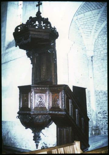 Cuve : ornée sur 5 pans d'un relief sculpté représentant le Christ et les 4 évangélistes accompagnés de leurs attributs. Chaque relief est séparé des autres par des tombées de feuillages de lauriers. Abat-voix : entouré sur le bord d'un rinceau de feuillage et sur l'avant d'une guirlande de fleurs. Calot : sculpté sur chaque pan d'une guirlande de fleurs et de rubans plissés en bas-relief. Les 4 angles séparent les pans et figurent 4 têtes d'aigle.