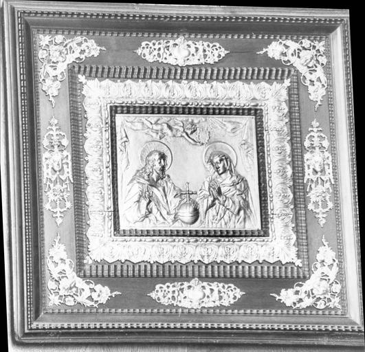Un cadre d'ébène à bords moulurés contient un deuxième cadre plus petit. Sur le plat entre les deux cadres, huit ornements de cuivre appliqués occupent les angles et le milieu de chacun des côtés. Ils sont constitues d'éléments végétaux et floraux stylisés avec angelots ou têtes d'angelots. Le cadre intérieur est orné, entre des rangées de billettes, de perles et d'oves, d'une frise continue de palmettes. A la partie supérieure de l'objet, deux angelots assis soutiennent de part et d'autre d'un coeur un médaillon servant de boucle d'accrochage. Couronnement de la Vierge : le Christ et la Vierge sont vus à mi-corps. A gauche, le Christ, nimbé, main droite levée avec deux doigts dressés, appuie la main gauche sur un globe trinitaire sommé d'une croix, placée dans l'axe de la composition. A droite, la Vierge, auréolée, avec voile sur la tête, regard baissé, joint les mains en avant de la poitrine. En bas du tableau, un petit ange volant à l'horizontale, présente une couronne de laurier vers la tête de la Vierge. Une tenture, tendue au dessus de lui, retombe de chaque côte du tableau.