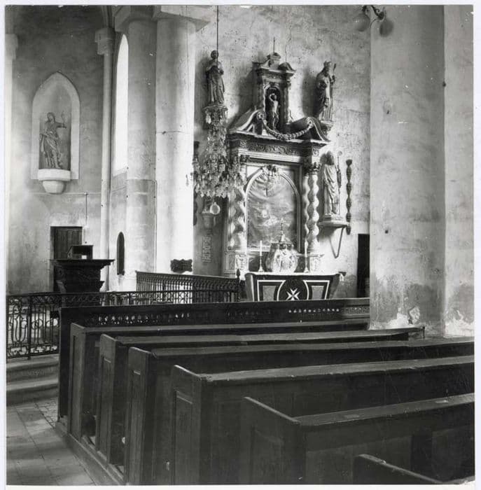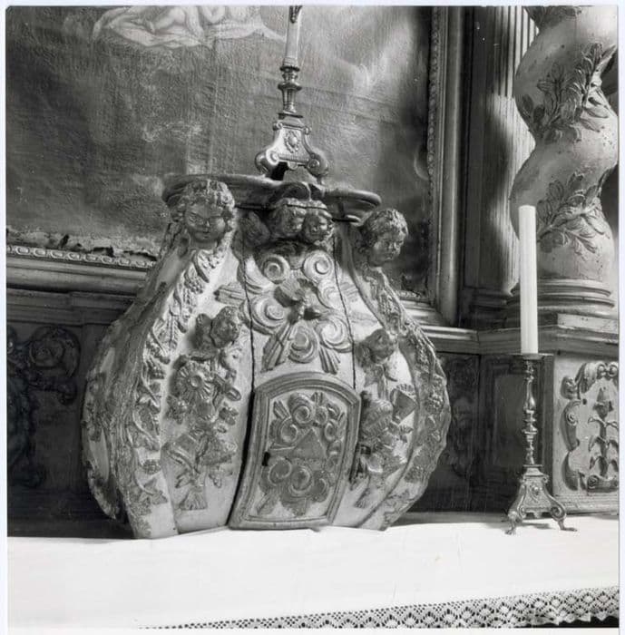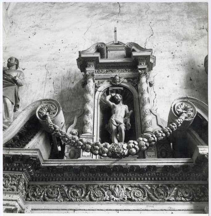 Corps principal encadré de deux pilastres et de deux colonnes torses, décorées de motifs sculptés dorés sur fond gris, avec des chapiteaux composites. Entablement décoré de rinceaux sculptés. Fronton courbe coupé, à enroulement intérieur, auquel est suspendue une guirlande de fruits et de fleurs. Niche supérieure encadrée par deux colonnes torses, portant un entablement et un fronton courbe coupé à enroulement intérieur. Tabernacle en bois à corps renflé décoré de sculptures.
