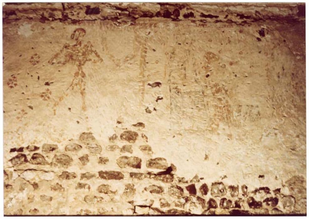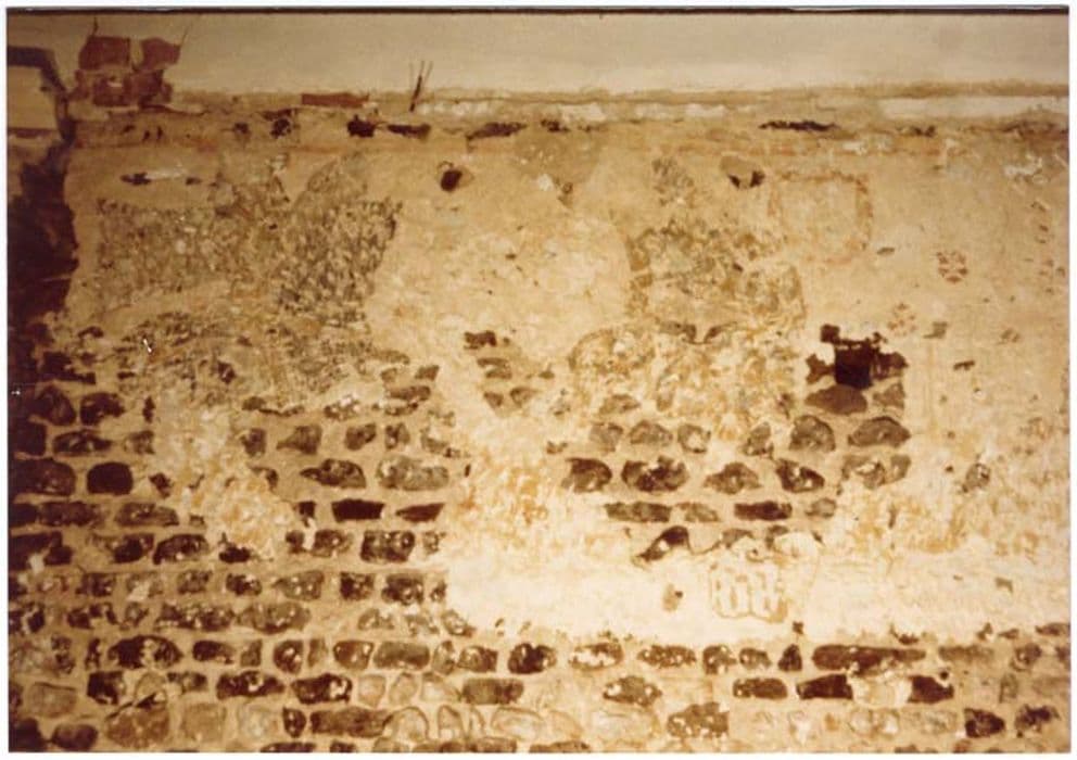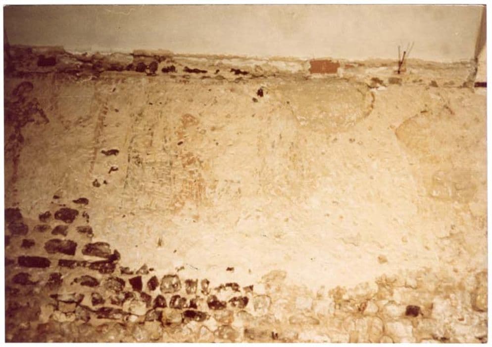 Les restes de peintures murales occupent la partie supérieure du mur où elles sont limitées par une bordure horizontale ocre.