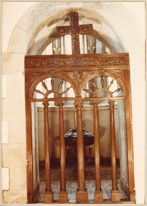 Porte à deux battants, comportant, en haut, à l'intérieur d'un cadre, deux arcades en demi-cercle contenant chacune cinq fuseaux s'appuyant sur un petit demi-cercle intérieur. Les arcades sont sommées d'une console débordant sur la moulure. Les arcades retombent au milieu sur une colonnette à chapiteau composite dont le fût est cannelé et repose sur un socle à section carrée. Leurs demi-cercles intérieurs s'appuient sur une traverse horizontale reposant sur deux colonnettes analogues à la colonnette centrale mais de plus petit diamètre.