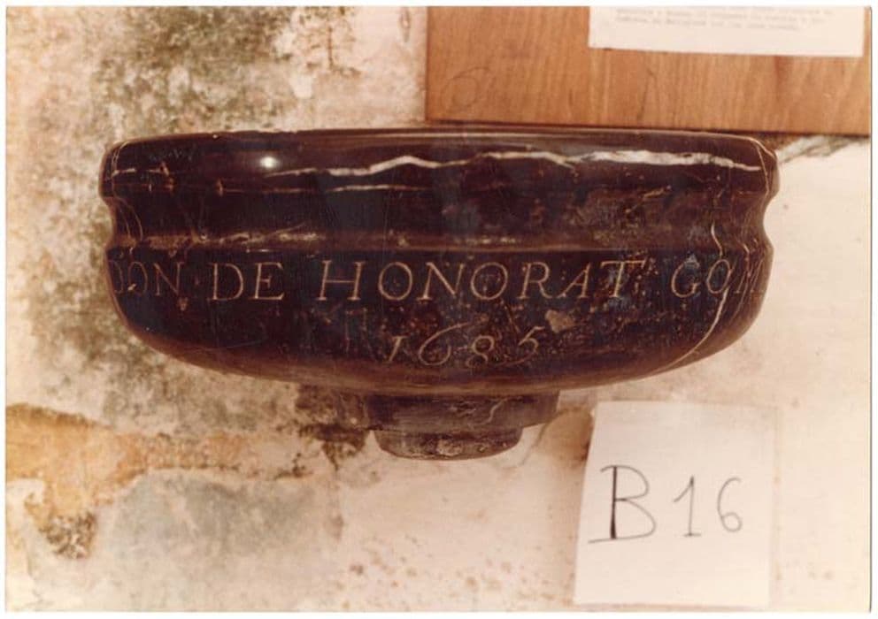 Cuve de forme ovale présentant en haut une large gorge sous le rebord. Petit culot en forme de tore double fixé au mur.