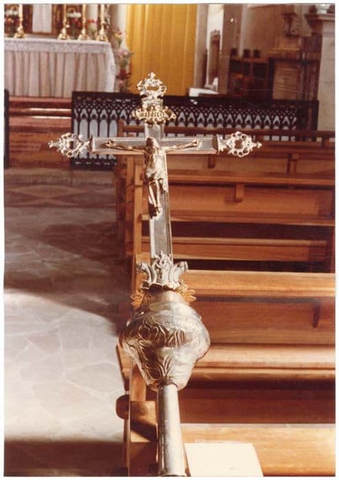 Hampe en bois. La partie métallique porte un noeud orné d'éléments végétaux et surmonté d'une collerette et de crochets. La croix est à bords perlés. Les extrémités du montant vertical et de la traverse sont prolongées chacune par un élément décoratif découpé à jour.