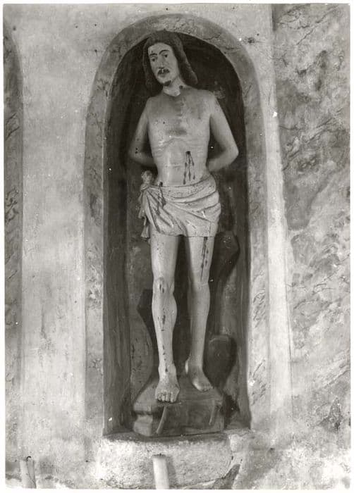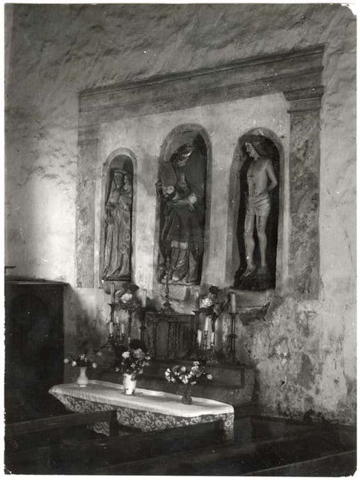 Les trois statues sont placées dans des niches, elles-mêmes encadrées par deux pilastres et un entablement peints sur le mur. La Vierge est en pierre, saint Denis en terre cuite et saint Sébastien en bois.