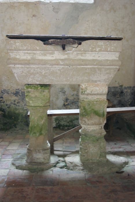 Fonts en pierre calcaire bleue. Cuve de forme rectangulaire. Sur chaque face le bandeau supérieur est à bords verticaux, la base à bords obliques. Entre les deux, un élément présente une gorge. La cuve est posée sur deux supports. Celui de gauche est une courte colonnette torsadée reposant sur un socle cubique et portant un chapiteau de même forme, aux angle inférieurs abattus. Celui de droite est constitué de bas en haut par : un socle à section carrée, aux angle rabattus, un tore entre deux gorges, un parallélépipède rectangle avec ornements sculptés aux angles, un entablement droit avec gorge à sa partie inférieure.
