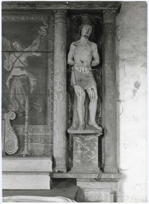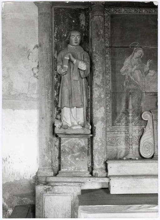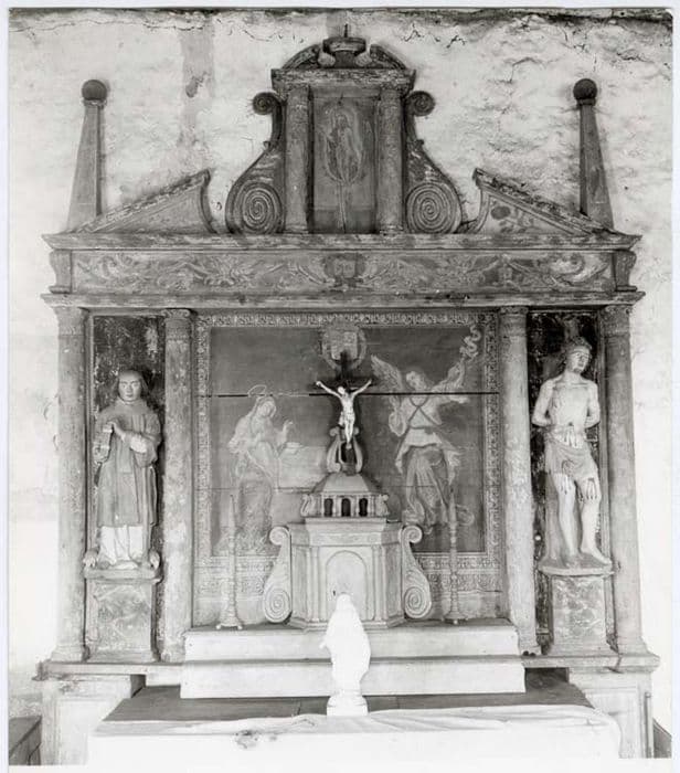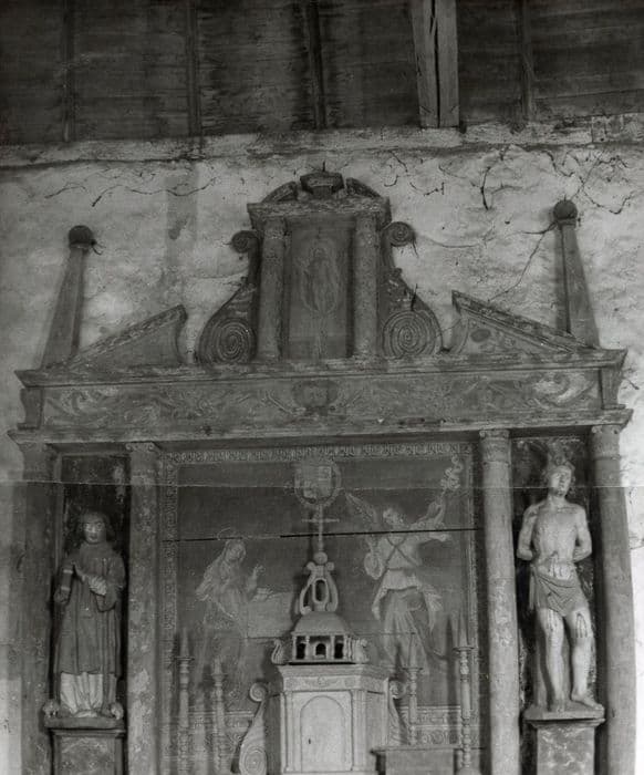 Retable en bois à quatre colonnes à chapiteaux composites. Dans la partie centrale, quatre panneaux peints encadrés par une frise de feuillages. Dans les parties latérales, entre les colonnes, des statues (en pierre à gauche et en terre cuite à droite) reposent sur des socles. L'entablement porte un décor peint. Au-dessus de l'entablement, un fronton coupé par une niche à colonnes bordée d'ailerons à enroulements contenant un panneau peint. Deux pyramides surmontées d'une boule aux extrémités de l'entablement.