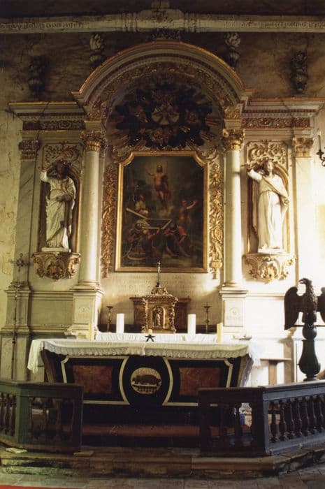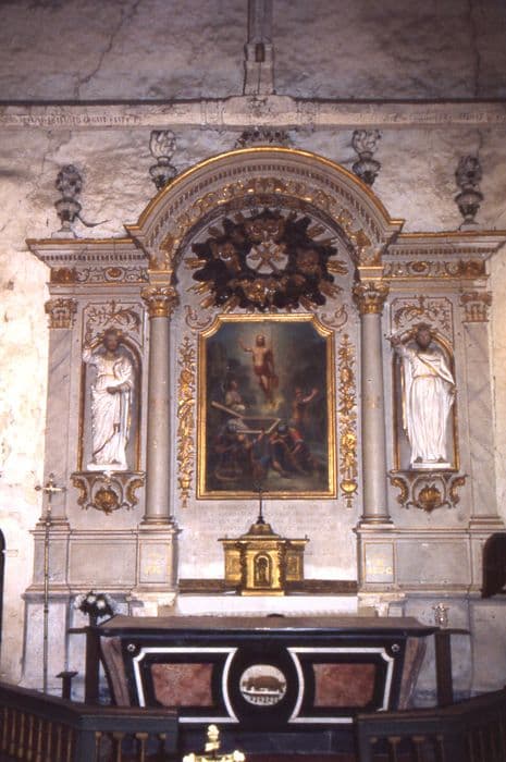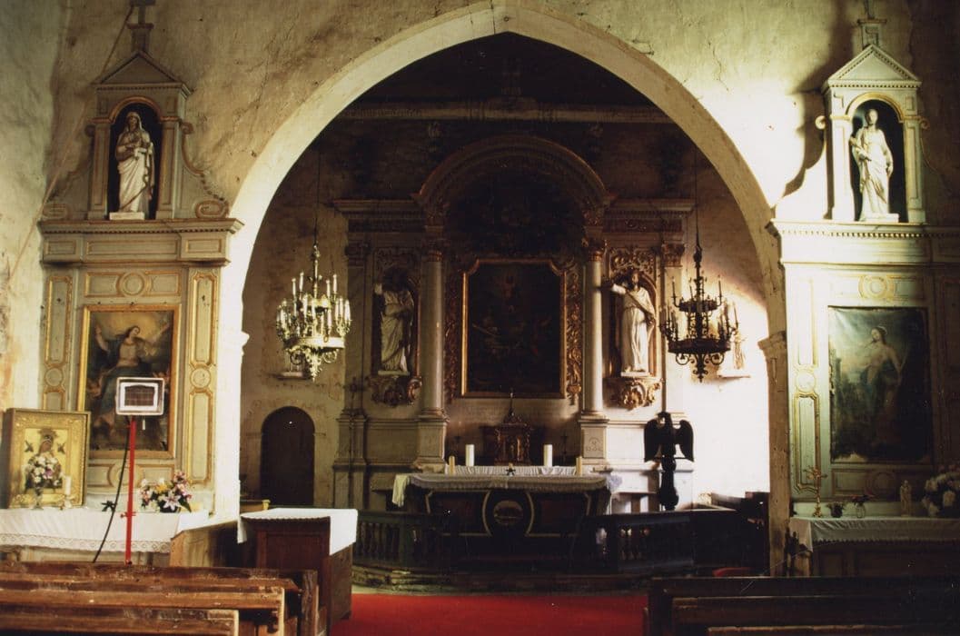 Retable en pierre, autel en marbre, gradin et tabernacle en bois doré, statues en plâtre.