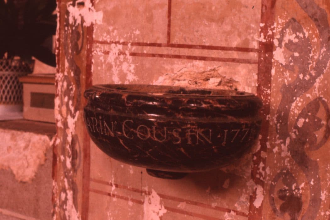 Bénitier de forme ovale. La cuve a une gorge à la partie supérieure.