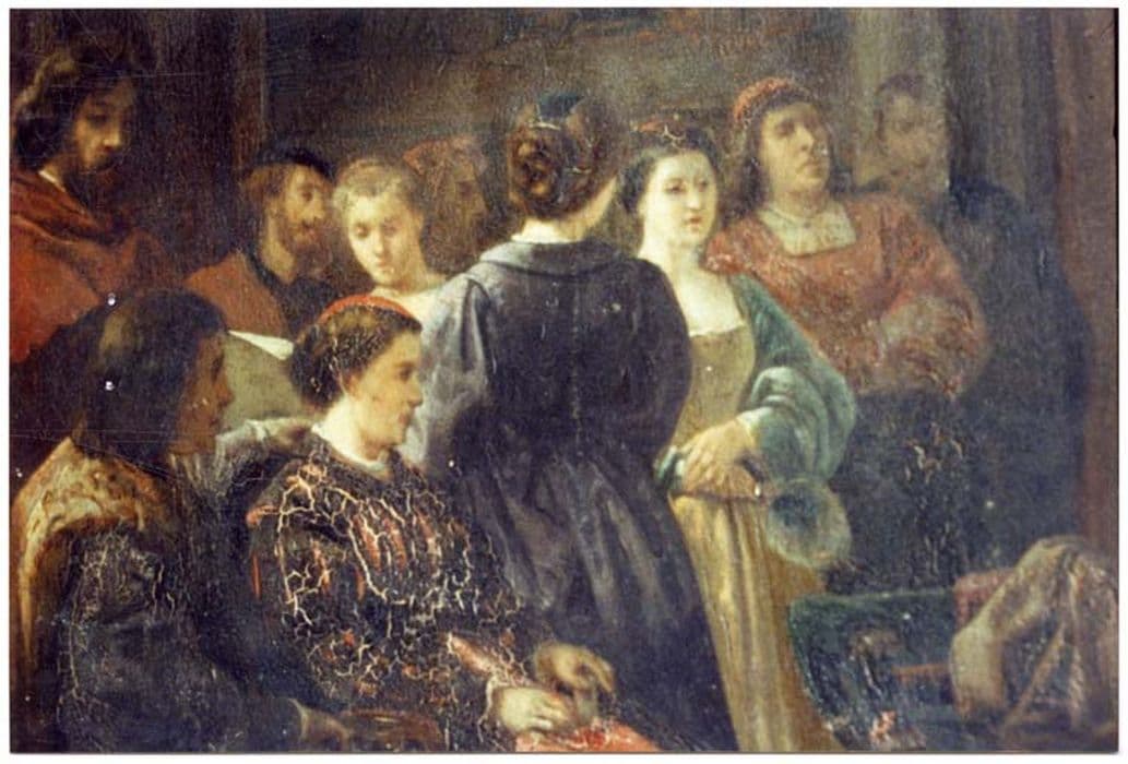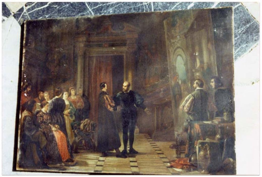 Au centre, un peintre présente à son commanditaire la toile qu'il vient d'achever. Chauve, il porte barbe et moustaches. Il est vêtu d'un habit noir à manches bouffantes bleu outre mer. Le commanditaire est vêtu d'un long manteau et serre la main de l'artiste. Sur le côté droit deux aides attendent appuyés contre une table chargée de hanaps. Sur le côté gauche, un groupe de courtisans, certains assis, d'autres debout, admirent l'oeuvre. Au fond, on distingue le bas d'une rampe d'escalier et une porte monumentale encadrée par des colonnes et surmontée d'un fronton interrompu. Le carrelage blanc et noir dessine des losanges. Le tableau a aussi pu être identifié comme représentant Le Corrège présentant un tableau à Michel-Ange.