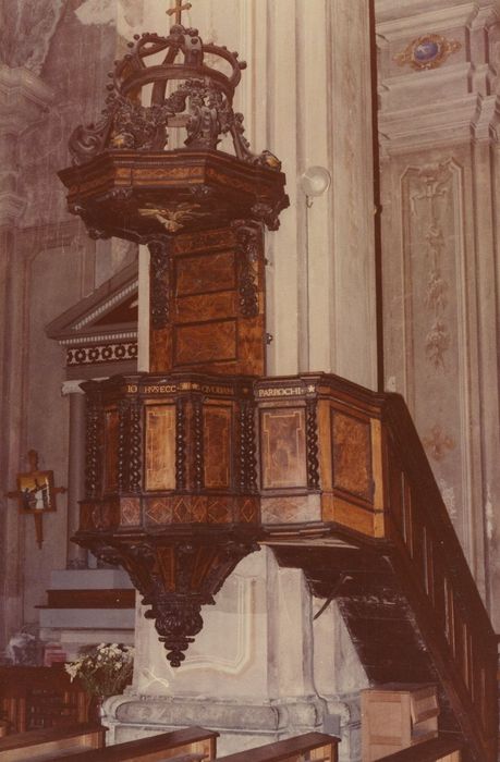 Inscription mentionnant le nom du curé qui a fait exécuter la chaire en 1710 : EXBENE (beneficentia) R.D. IACO DVNANT 1710 HVS QVODAM PARROCHI.