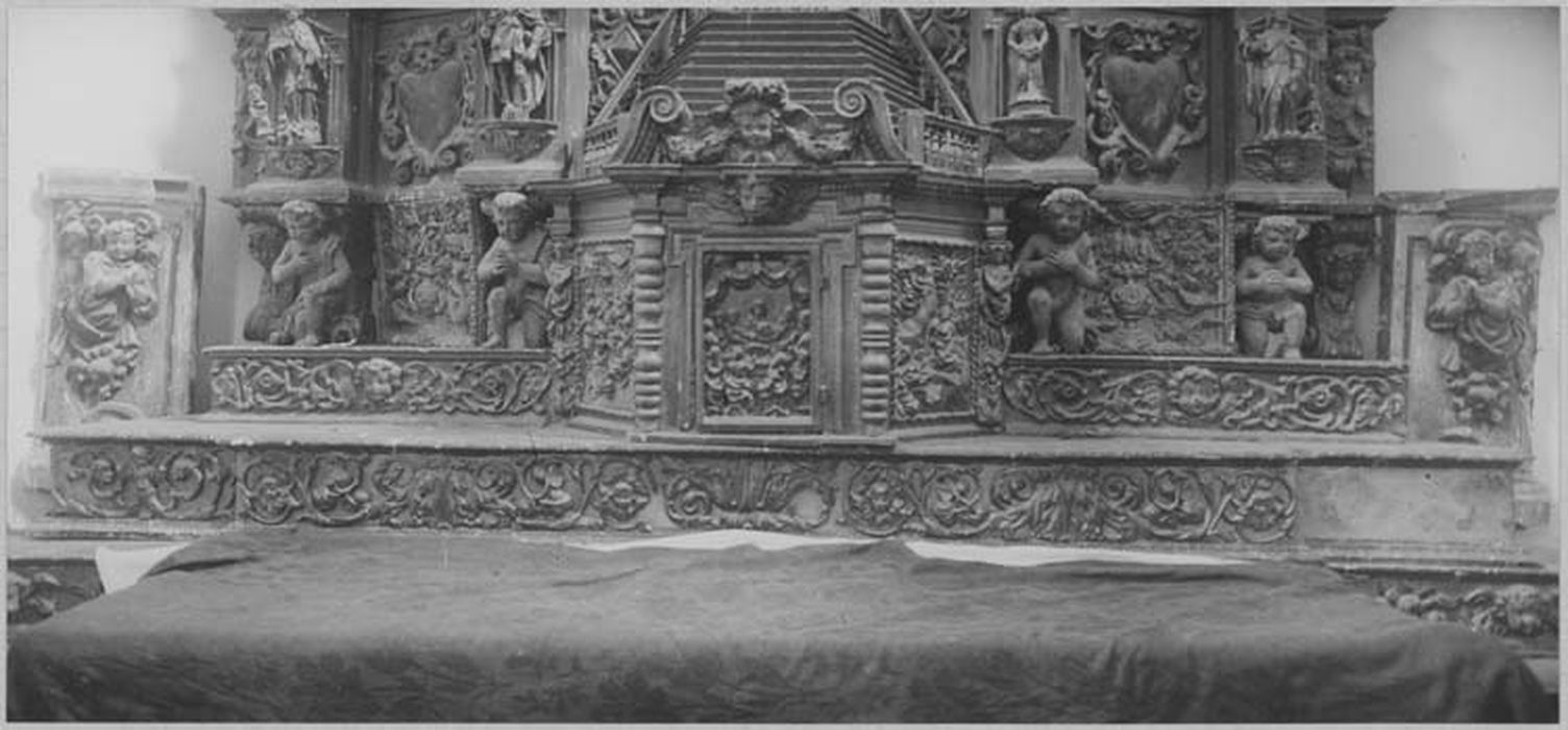 inscription et date à la base du retable : ANNO 1673 AD MAIOREM JESV GLORIAM HOC OPVS FECIT FIERI MARTINVS MONTMEYEVR RESCVRATVS MEI SVCCESSORES BENEVOLI ORATE PROME PECCATORE MISERERO QVI MODO HOC SOLVM SVPER EST SEPVLCHRVM.