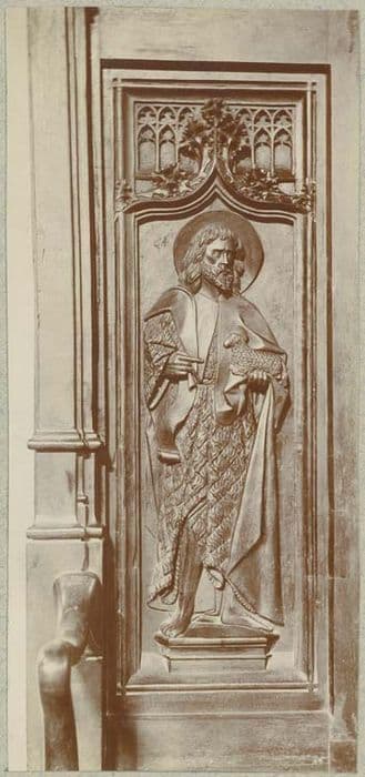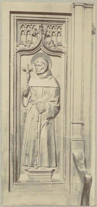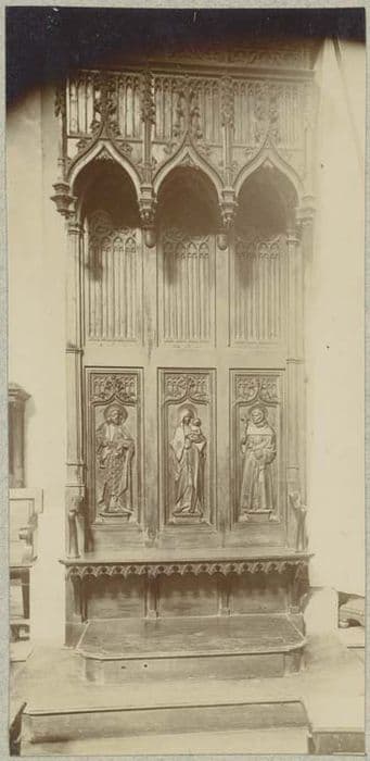 Structure à haut dossier avec dais, monté sur estrade à deux emmarchements ; banc à accoudoir. Trois panneaux verticaux en bas-relief en dosseret.