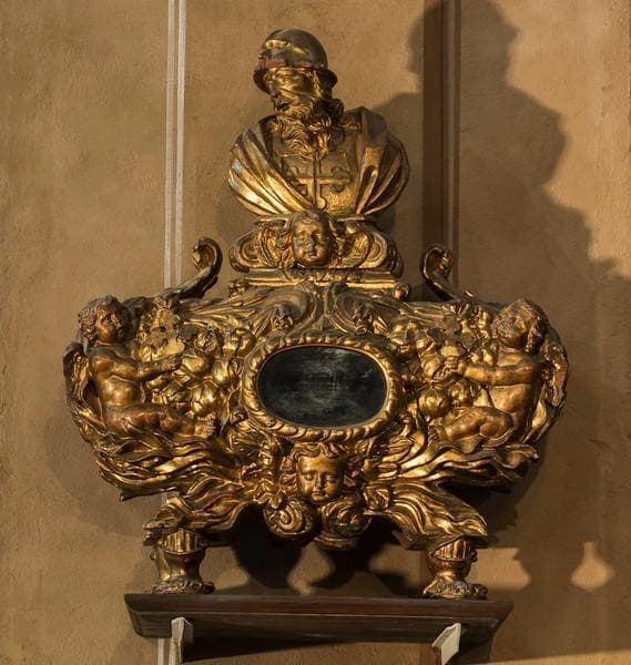 Cénotaphe supporté aux angles par des anges tenant la croix treflée de saint Maurice et décoré de rinceaux largement traités sur chacun des deux grands côtés une monstrance ovale. Ce monument est surmonté d'un buste de saint Maurice drapé, coiffé, barbu, un casque à tête humaine portant sur la tête portant sur la poitrine la croix treflée. Ce buste est un soubassement décoré d'une tête d'ange est mobile et sert de couvercle au cénotaphe.