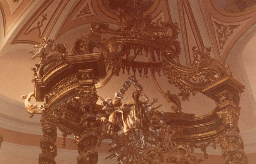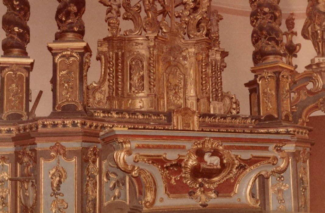 Le retable à baldaquin est formé de six colonnes torses s'élevant sur un plan ovale.
