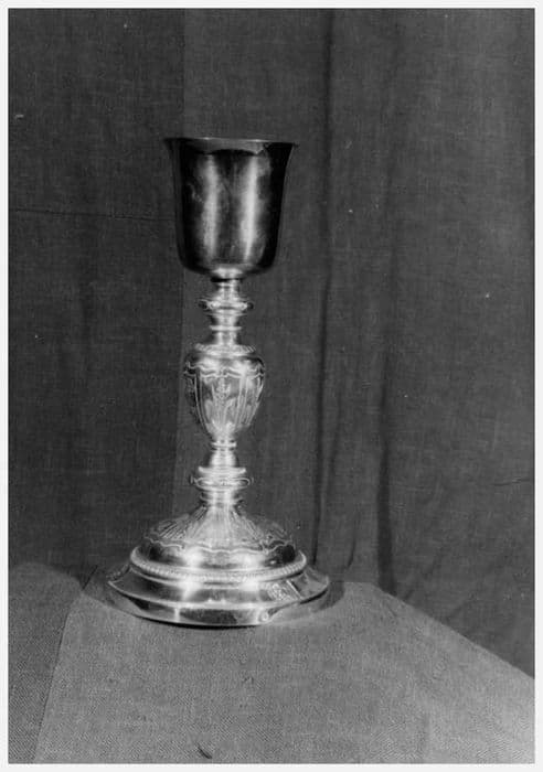 Calice en argent gravé et argent doré pour l'intérieur de la coupe, qui est lisse. Tige filetée interrompue par un noeud.