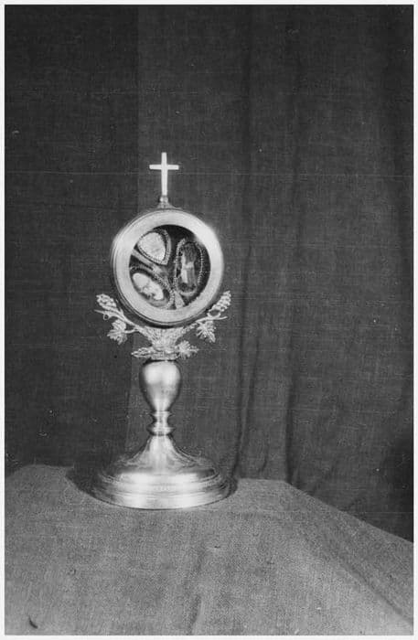 Reliquaire en métal argenté sur tige giletée avec noeud et pied circulaire, surmonté d'une croix en laiton. A l'intérieur : trois logements en tissus contiennent de la chair et des fibres des vêtements de saint Pierre II, archevêque de Tarentaise. Au-dessus du noeud, rinceau de vigne en étain mobile ne faisant pas partie du reliquaire.