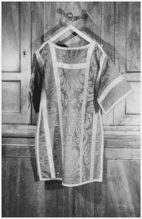 Fond : damas de soie vert.Galon : or.Doublure : coton couleur puce.Ruban de soie vert sur les épaules.Seconde dalmatique identique sans les rubans, même état.