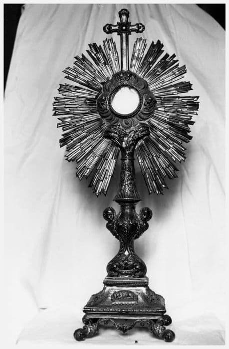 tête : ange ; Agneau mystique ; grappe : vigne ; blé ; croix ; nuée ; rayons lumineux