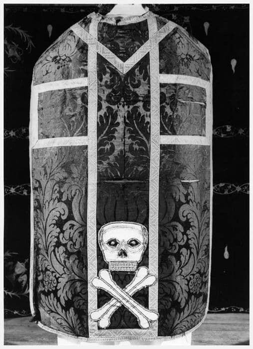 ornement funéraire : deux dalmatiques, deux chasubles, deux voiles de calice, une étole de clerc, quatre manipules, deux pales et une bourse de corporal