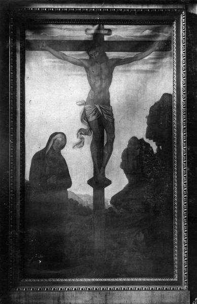 Arrêté : Le Christ en croix, toile, "copie du panneau central d'un triptyque de la fin du XVe siècle, dont l'original appartient au Musée de l'Ermitage, milieu 19e siècle" (mention manuscrite).