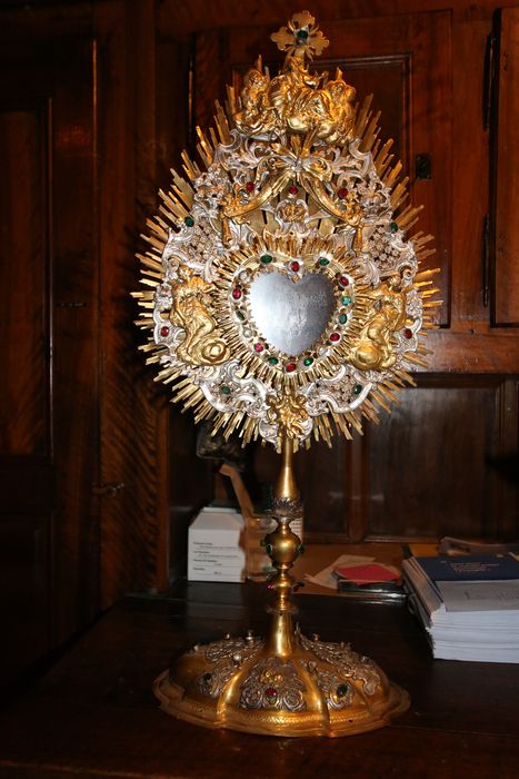 Verres de couleur sertis. Autour de la monstrance, en forme de coeur, se déploient deux rangées de rayons. Le bord interne de la première est souligné de cabochons de verroterie. Entre les deux, un décor rocaille, parsemé de cabochons, d'angelots dont deux tiennent une guirlande, et de deux allégories féminines d'un gracieux mouvement. (Raymond Oursel).