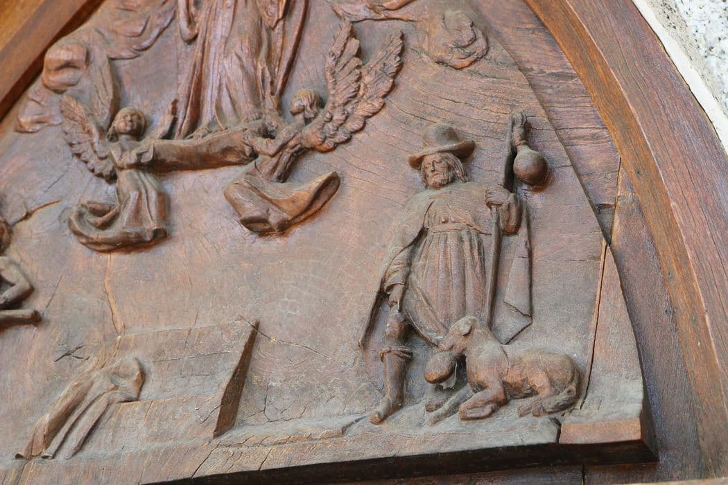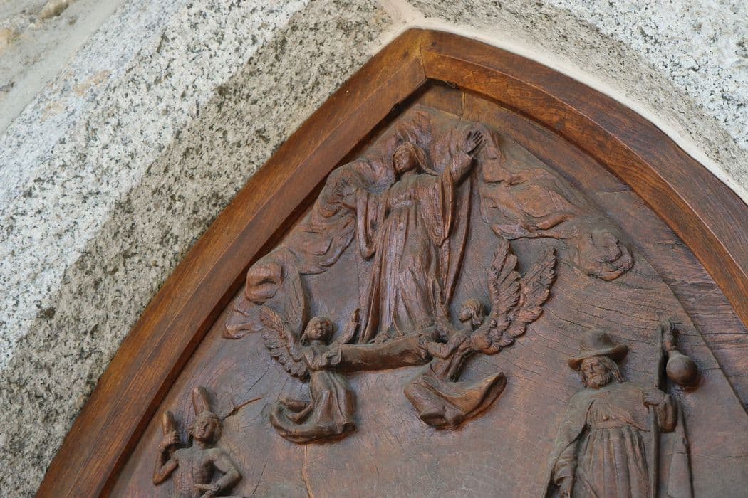 Bas-relief représentant l'Assomption de la Vierge, élevée dans les cieux par deux anges dans la partie supérieure. Entourant son tombeau vide dans la partie inférieure, figurent saint Sébastien à senestre et saint Roch à dextre.