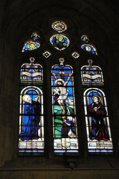 h = 128 ; la = 46 ; Dimensions de troix vitraux ; vitrail saint Sébastien : h = 46, la = 68