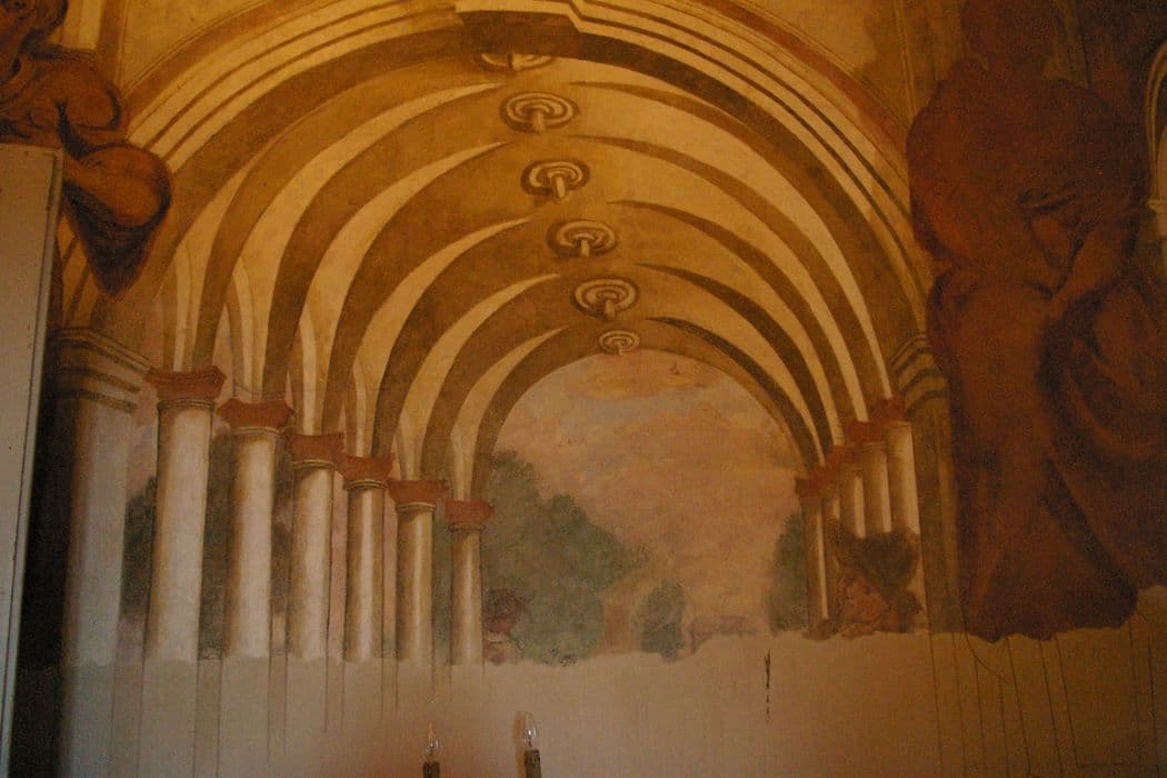 peintures monumentales de la salle du 1er étage : personnages dans des cartouches, vues d'église