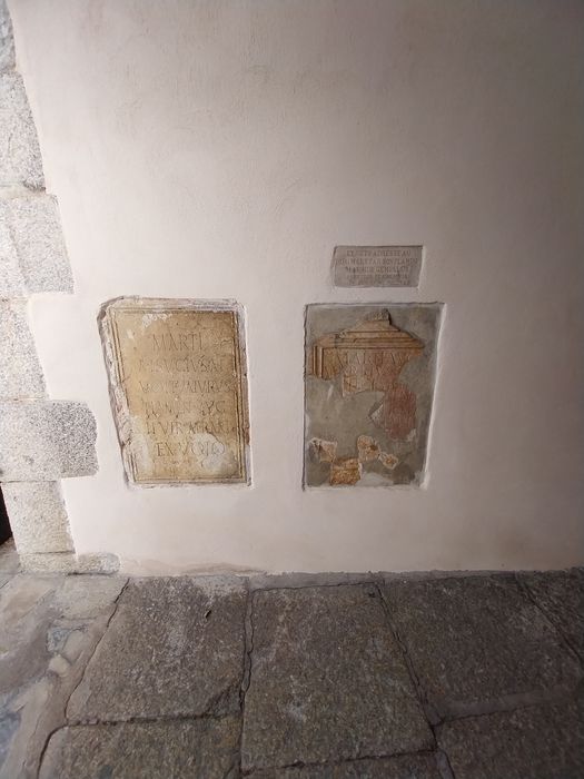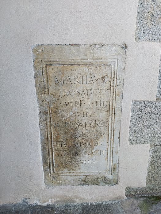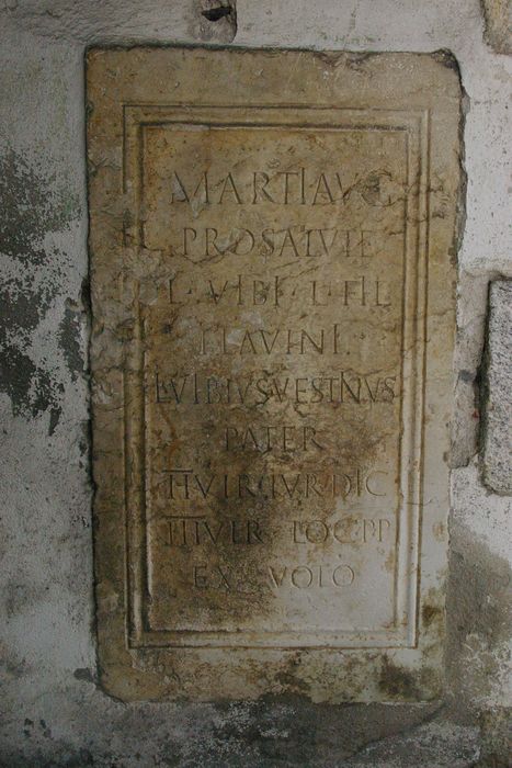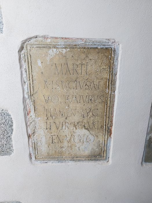 inscription romaine de la 1ère plaque : MARTI AVG PRO SALVTE L. VIBI. L. FIL FLAVINI L. VIBIVS. VESTINVS PATER II VIR. IVR. DIC III VIR LOC. P. P. EX VOTO. inscription romaine de la 2e plaque : MARTI A. ISVGIVS. A. F. VOLTVATVRVS FLAMEN AVG II VIR AERARI EX VOTO.