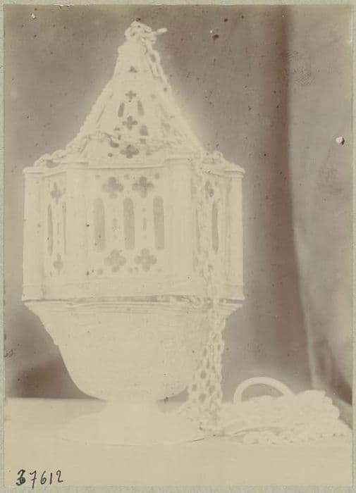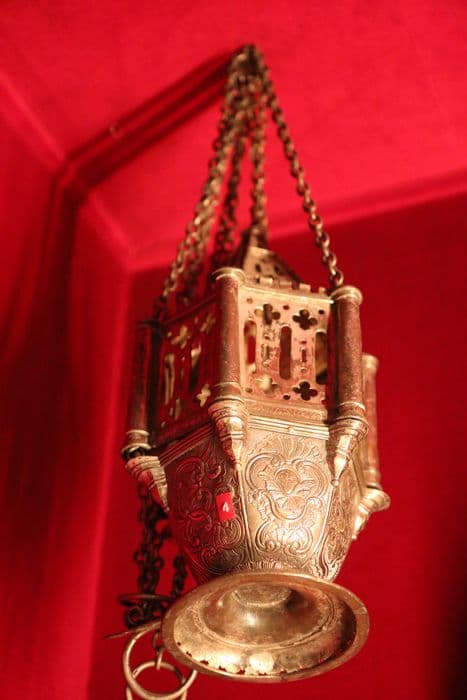 Le pied cylindrique dont le bord est orné de feuilles stylisées, soutient l'encensoir dont la base est à six faces ornés alternativement de rinceaux et de médaillons. De l'arête de chaque angle, s'élève une console soutenant une colonne. Les six colonnes supportent le couvercle en forme de pyramide hexagonale ajouré de quadrilobes et de trèfles. Une inscription court sur le bord du fût hexagonal. Le couvercle est du XVIe siècle mais la partie inférieure de l'encensoir portant un décor de cartouches et de coquilles date du XVIIIe siècle.