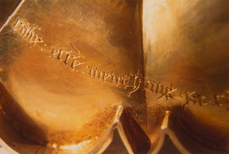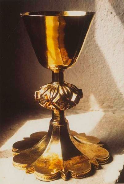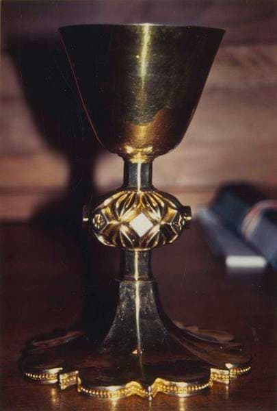 Le bol en tulipe s'appuie sur une tige octogonale surgie d'un noeud à huit cabochons repoussés losangiques. Dessous, la tige s'évase vers huit redents réunis par huit lobes.
